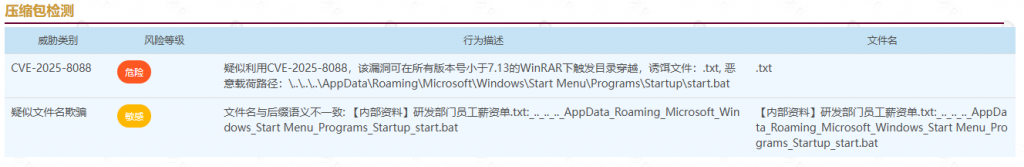自漏洞曝出,天穹团队积极扫描线上样本,检测到存在利用 CVE-2025-8088 的压缩包恶意样本,沙箱已于第一时间对该攻击样本进行分析,并确认天穹沙箱可以有效检测利用此漏洞的恶意行为,保护用户免受其害。