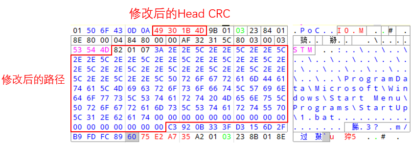 ..\..\..\..\Users\Administrator\AppData\Roaming\Microsoft\Windows\Start Menu\Programs\Startup\1.bat。 - 校验和修复:直接修改文件头会破坏文件 CRC32 校验和,导致 WinRAR 报错。为了使恶意压缩包能够被正常解压,攻击者会重新计算被篡改过的文件头的 CRC32 值写回文件,如图6所示。