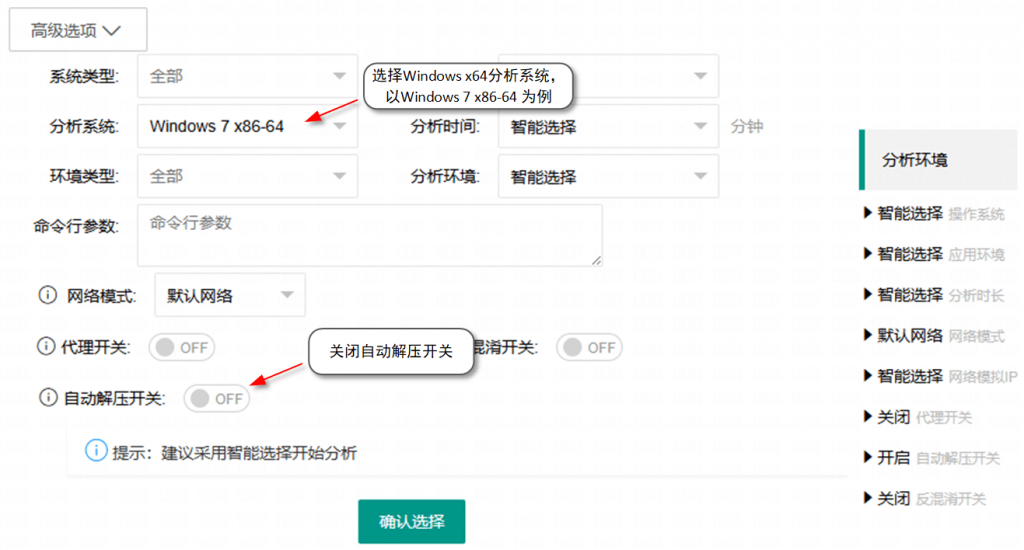 2. 选择分析环境及配置项,如图 1 所示,选择 Windows x64 作为分析系统,配置自动解压开关为 OFF,点击确认选择;