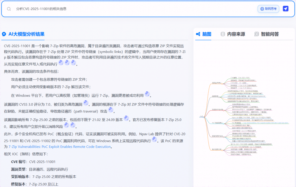 借助天穹智能分析平台了解 CVE-2025-11001 漏洞的详细信息,如图 4 所示,智能体总结了漏洞成因、攻击条件、影响版本、PoC代码等信息,并以脑图形式直观展示分析结果之间的关联和层级结构。