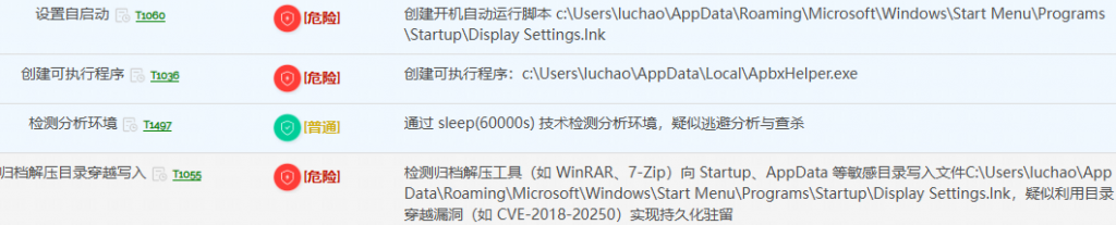 3. 越权写入:WinRAR 绕过用户指定的解压目录(如 C:\Downloads),直接将恶意文件写入启动目录,完成持久化驻留。
