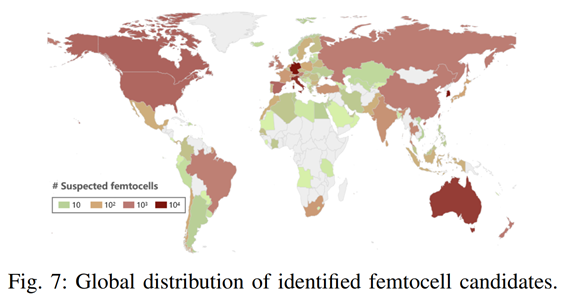 这项工作对真实世界中的 4G LTE femtocell 进行了系统性的安全评估。我们分析了 4 款来自不同厂商的商用 femtocell 设备,从硬件与软件两个层面识别出 5 类可导致本地或远程攻破的共性漏洞。在此基础上,我们在受控实验环境中进一步分析了被攻破 femtocell 对用户侧业务的安全影响,验证了对数据业务、语音通话以及短信服务的威胁,例如用户通信内容的机密性可能在特定场景下面临风险。随后,我们进一步开展了互联网规模测量,基于 IKEv2、TR-069 及管理接口等协议特征,在全球 IPv4 空间中识别出 86,108 个疑似 femtocell 部署实例,其中超过六成为高置信度目标。研究结果表明,femtocell 在真实网络中的暴露程度与安全风险显著,一台被攻破的 femtocell 即可能成为攻击用户与核心网络的重要入口。基于上述发现,我们讨论了其安全影响,并提出了针对设备、部署与标准层面的缓解建议。