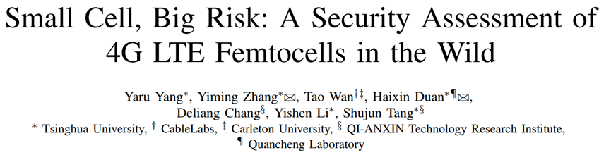 第五篇论文是由清华大学、奇安信技术研究院、CableLabs、Carleton University 及泉城实验室合作完成的关于 4G LTE femtocell 安全风险评估的研究工作。论文题目为 《Small Cell, Big Risk: A Security Assessment of 4G LTE Femtocells in the Wild》。该项工作由清华大学和奇安信联合培养的卓越工程师计划博士研究生杨雅儒主导完成,导师为段海新教授(清华大学、泉城实验室)和汤舒俊(奇安信技术研究院)。其他作者分别为张一铭(清华大学)、万涛(CableLabs & Carleton University)、常得量(奇安信技术研究院)、李义申(清华大学)。
