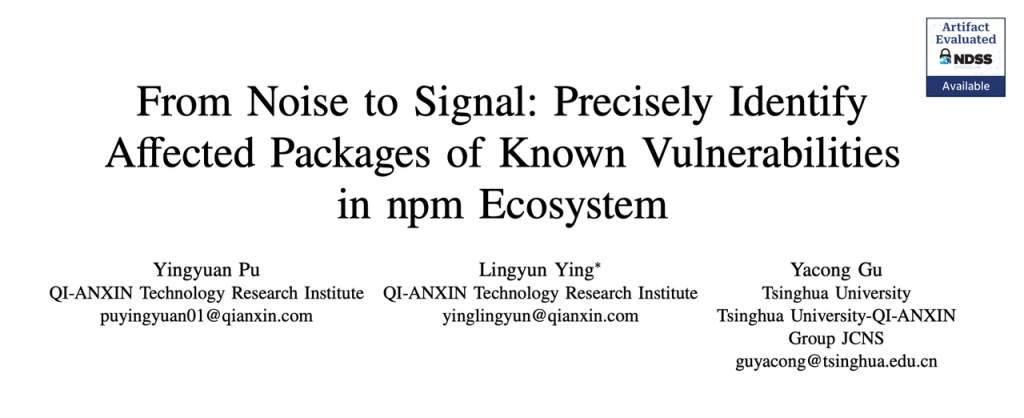 这正是奇安信技术研究院和清华大学研究团队在 NDSS 2026 会议上发表的论文所要解决的核心问题。论文题目为《From Noise to Signal: Precisely Identify Affected Packages of Known Vulnerabilities in npm Ecosystem》,作者为蒲应元(奇安信星图实验室),应凌云博士(奇安信星图实验室)和谷雅聪博士(清华大学)。这项研究针对全球最大的开源软件生态系统——npm(拥有超过 300 万个包,2024 年处理了约 4.5 万亿次请求),提出了一套基于函数调用关系的细粒度漏洞传播关系识别方法和分析框架。论文分析结果表明,传统工具所产生的漏洞警告中,高达 68.28% 都是”噪声”,即漏洞代码实际上根本无法被触达。