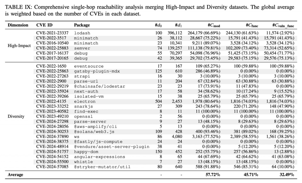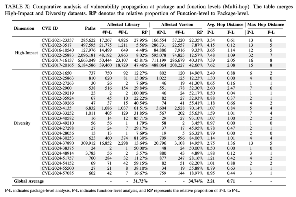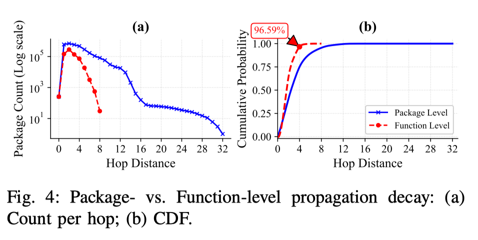 最后,在上图也更进一步可视化了漏洞传播随依赖链路深度的衰减过程,分别从两个不同的视角来进行呈现。图(a)展示了每一跳(Hop)中新增受影响包数量的分布情况。对比显示,函数级别(红色曲线)的传播在 3 跳 之后呈现出急剧的衰减趋势,与包级别(蓝色曲线)的长尾分布形成显著差异。这证实了真实的漏洞影响范围会随着依赖深度的增加而迅速减弱。而图 (b) 展示了传播过程中的累积概率分布情况进一步佐证了这一“浅层效应”:函数级传播曲线迅速收敛并达到平台期,数据显示 96.59% 的真实受影响包均收敛在 4 跳 的范围内。这意味着,尽管依赖图谱可能具有较深的层级结构,但具有实际威胁的漏洞传播主要局限于浅层依赖网络中。