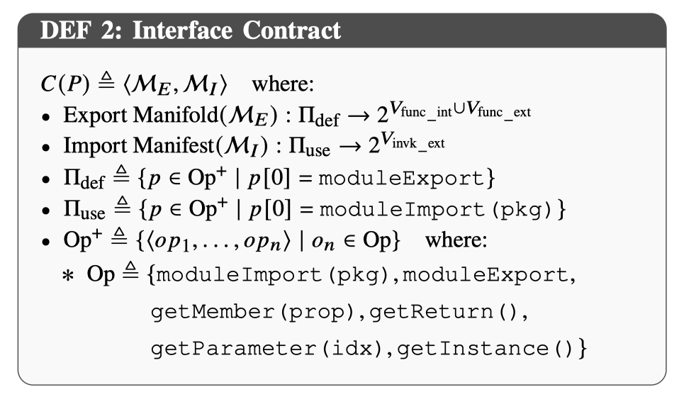 虽然 RSG 保留了包的全部内部细节,但如何让独立分析的包能够正确”对接”?这就涉及到了提取形式化的接口契约。VulTracer 从这张复杂的图中提取出了一份简洁的形式化接口契约(Interface Contract)。这就像是给每个软件模块定义了标准的“插头”和“插座”,契约中清晰地记录了 API 的导出方式(Export Manifold)和导入方式(Import Manifest)。这一步至关重要,它充当了一道“语义防火墙”,屏蔽了复杂的内部实现细节,只保留了交互所需的关键信息。具体的定义如下图DEF2 所示。