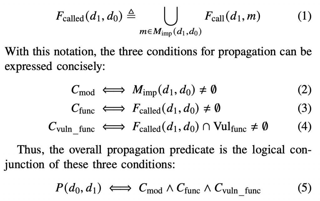 我们首先聚焦于d₁ → d₀的单跳关系,这样可以排除多跳传播的复杂因素,精确归因。在我们的研究中建立了三层漏洞传播条件:仅引入模块 (C_mod)、调用任意函数 (C_func)、调用漏洞函数 (C_vuln_func)。定义如下图所示: