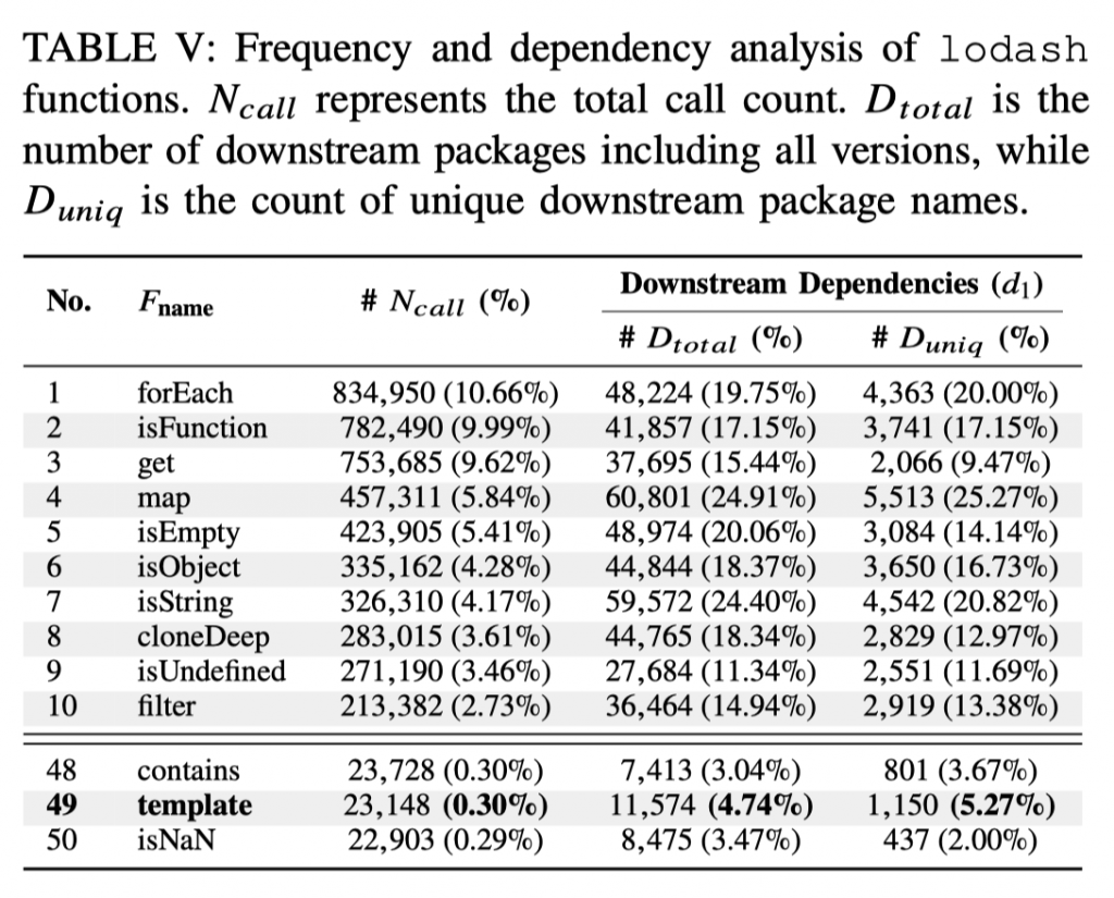 我们发现平均 22.80% 的直接依赖包声明了依赖,但从未导入任何模块(C_mod失败)。以 lodash 为例:存在 396,112 个声明依赖的包,但是有 131,933个”僵尸依赖” (33.31%)。这13万多个包背上了”有漏洞”的标签,但实际上完全不受影响。同时我们还发现,npm 第三方库的 API 设计决定传播率。同样的对于 lodash 这样一个综合工具库,拥有242个函数,但漏洞函数 template 只占所有调用的0.30%,排名第49位,详细分析如下图所示。说明这个函数的下游使用率并不高。与之相反的是 debug 库,它功能单一专注于调试,其核心功能函数就是其主函数,导致直接依赖者的受影响比例高达 71.77%。